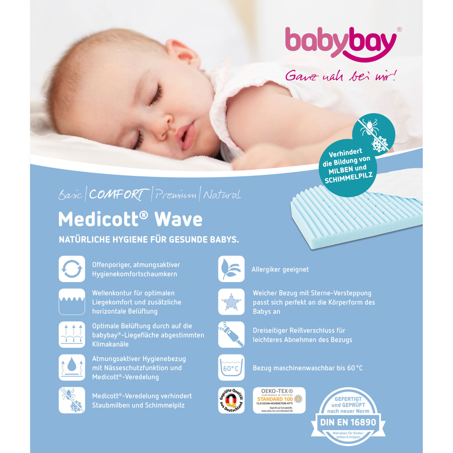 Der gesunde Babyschlaf ist ein wichtiger Bestandteil einer guten Entwicklung. Die Matratze babybay MediTex® Wave trägt hierzu bei. Der innovative Hygienebezug verhindert effektiv und zuverlässig das Durchdringen von Nässe. Der Hygienebezug MediTex® mit Sterneversteppung passt sich perfekt an die Körperform des Babys an, wirkt stützend und sorgt für einen tiefen, langen, erholsamen und traumhaften Babyschlaf.