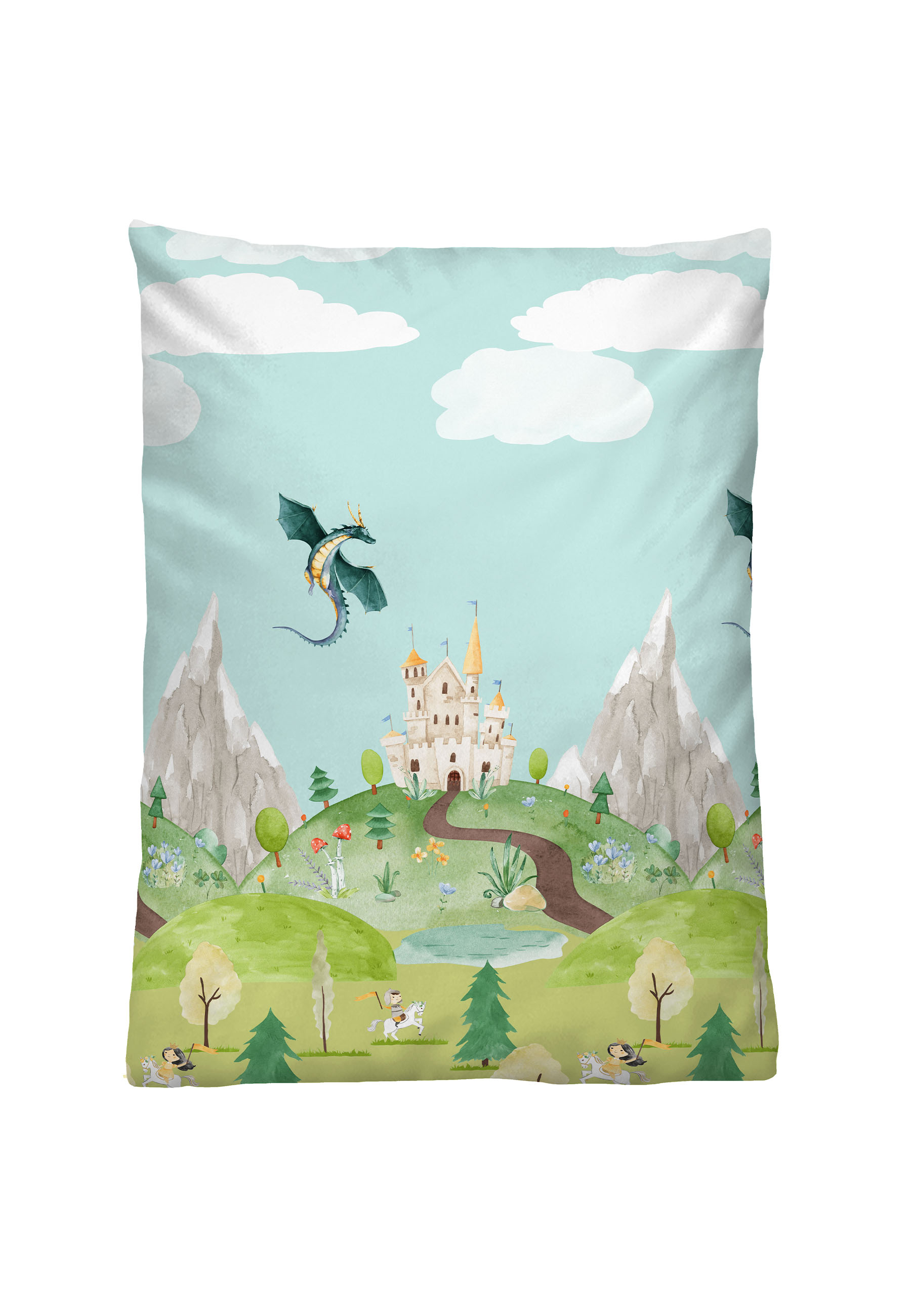 Eine schöne Bettwäschegarnitur aus 100% Baumwolle, die eine tolle Landschaft zum Thema Ritterburgen und Drachen abbildet. Die Linon-Bettwäsche aus reiner, feinfädiger Baumwolle ist angenehm weich, hautsympathisch und pflegeleicht.