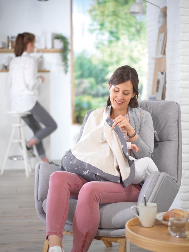 DAS PLUS: ein schönes Stilltuch, als Blickschutz und auch als zusätzlicher Sonnenschutz*, wenn Mutter und Baby unterwegs sind. Und in der kleinen Tasche lassen sich auch Schmusetuch, Schnuller oder Fläschchen gut unterbringen.