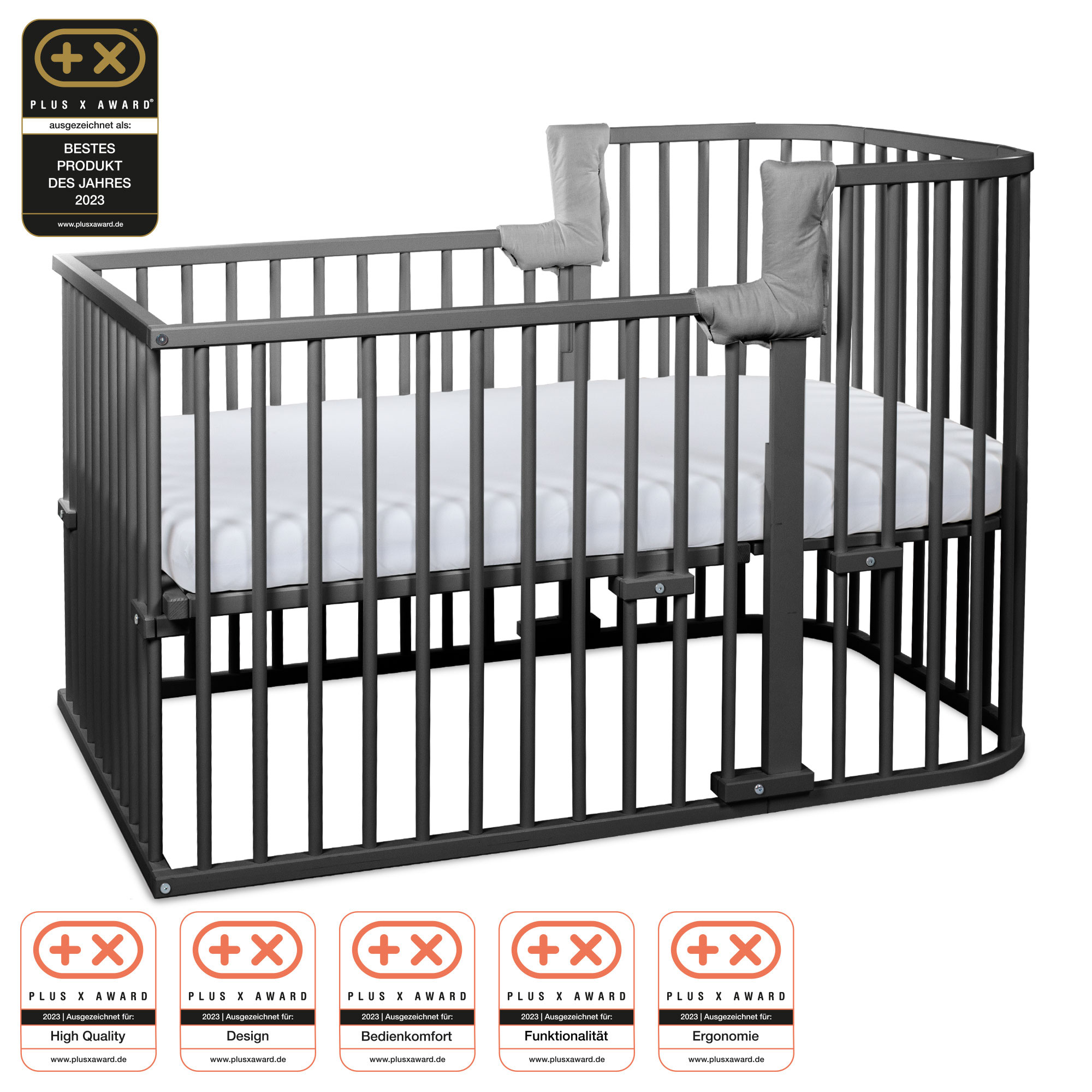 Sie können das Kinderbett durch Abnehmen eines Seitengitters auch als Beistellbett weiterverwenden. Wenn Ihr Kind größer wird sorgt das Abnehmen ebenfalls für ein bequemes Ein- und Aussteigen. Auch als Kindersofa super bequem
