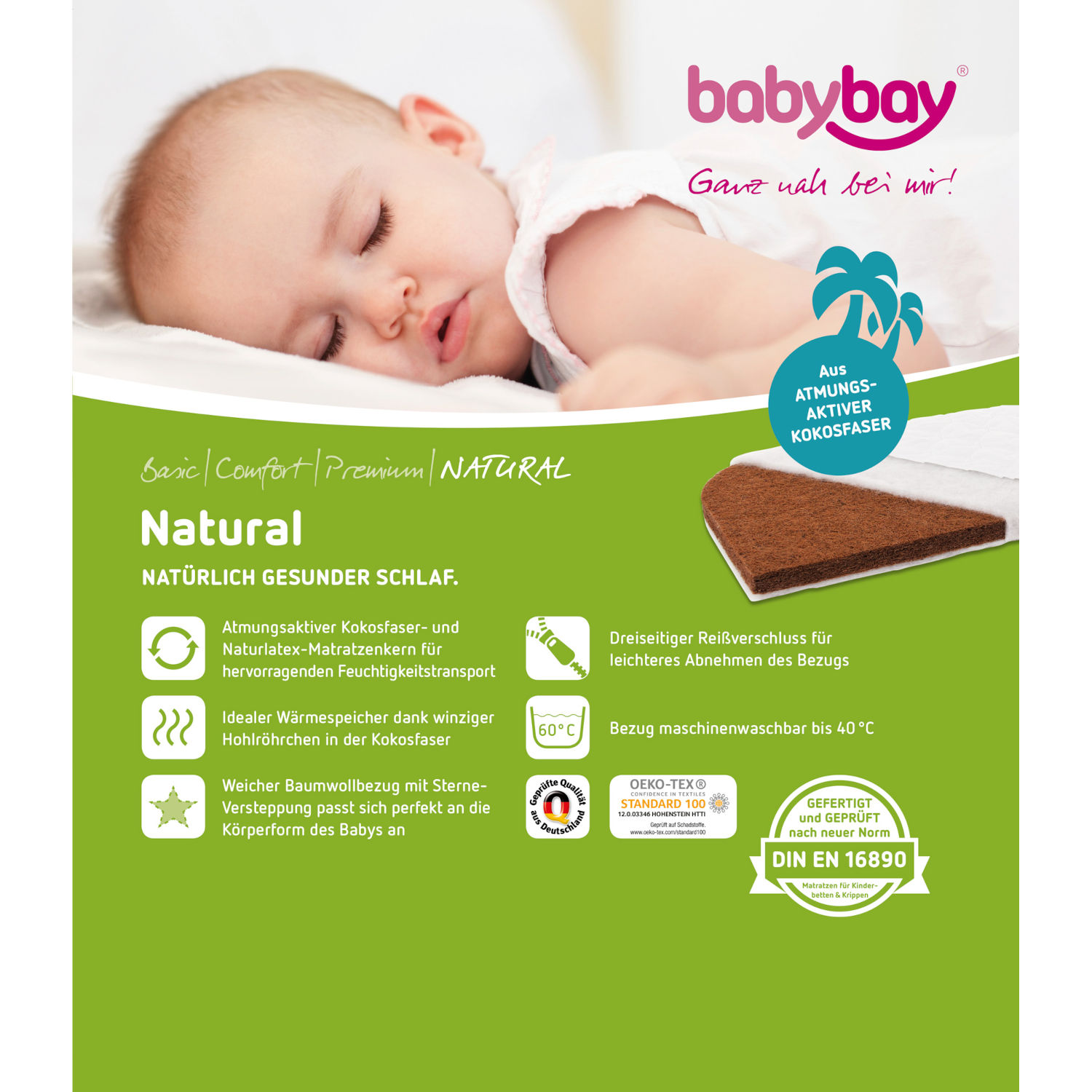 - Atmungsaktive Kokosfasern mit Naturlatex gebunden
