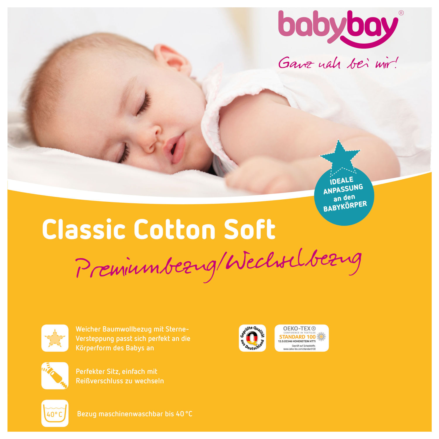 Schlummern, Strampeln, Schwitzen – der Bezug einer Matratze im Bett Ihres Babys muss so einiges an Belastung aushalten. Unser bewährter babybay Classic Cotton Soft Premiumbezug mit der robusten babybay-Qualität macht alles mit. Zusammen mit dem Matratzenkern erzeugt der wunderbar weiche Baumwollbezug ein babygerechtes Mikroklima: Luft kann optimal zirkulieren, ohne dem Körper dabei zu viel Wärme zu entziehen. Der babybay Classic Cotton Soft Premiumbezug passt sich durch die aufwendige Versteppung des Bezuges im Sternedesign ideal der Körperform Ihres Lieblings an, wirkt stützend und sorgt so für einen tiefen, langen, erholsamen und traumhaften Babyschlaf. Durch einen Reißverschluss ist der Bezug abnehmbar und kann bis 40°C gewaschen werden. babybay Classic Cotton Soft Premiumbezug – für einen gesunden, ruhigen Babyschlaf. Alle Matratzenbezüge sind schadstoffgeprüft und ausgezeichnet mit dem Zertifikat „Textiles Vertrauen“ nach Ökotex-Standard 100 Klasse 1 für Babys (12.0.03346).