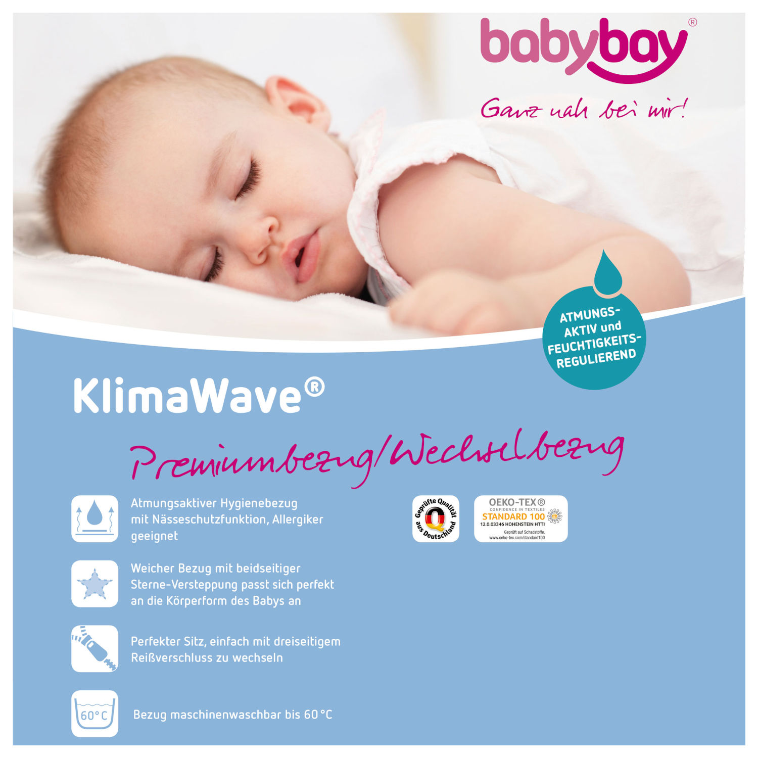 Für den natürlichen Schlafrhythmus Ihres Babys spielt die Beschaffenheit des Matratzenbezuges eine wichtige Rolle. Vor allem muss durch nächtliches Schwitzen entstehende Feuchtigkeit effektiv abtransportiert werden. Die optimale Sauerstoffzufuhr beugt einem Wärmestau vor. Der babybay Klima extraluftig Premiumbezug bietet einen effektiven und zuverlässigen hygienischen Schutz vor Nässe und Feuchtigkeit, ist aber dennoch luftdurchlässig. Sie benötigen keine zusätzliche wasserabweisende Auflage! Der wunderbar weiche Hygienebezug passt sich durch die aufwendige Versteppung im Sternedesign ideal der Körperform Ihres Lieblings an, wirkt stützend und sorgt so für einen tiefen, langen, erholsamen und traumhaften Babyschlaf. So fühlt sich Ihr Baby rundum wohl. Der Bezug lässt sich durch seinen dreiseitigen Reißverschluss jederzeit leicht abnehmen und ist bis 60°C waschbar. Alle Matratzenbezüge sind schadstoffgeprüft und ausgezeichnet mit dem Zertifikat „Textiles Vertrauen“ nach Ökotex-Standard 100 Klasse 1 für Babys (12.0.03346).