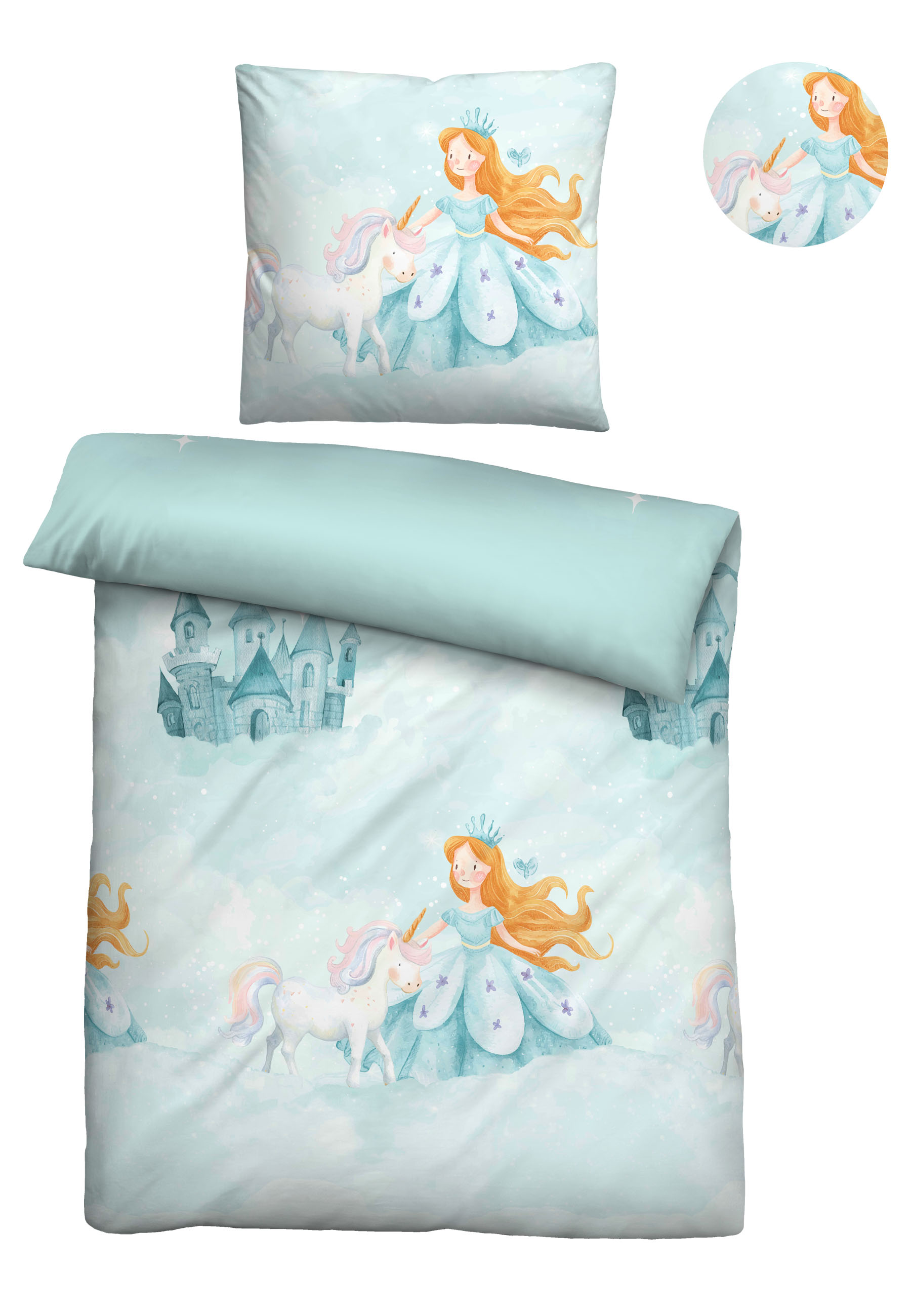 Eigenschaften "Biberna Feinbiber-Bettwäsche Prinzessin und Einhorn, Größe 135x200 cm, ciel"