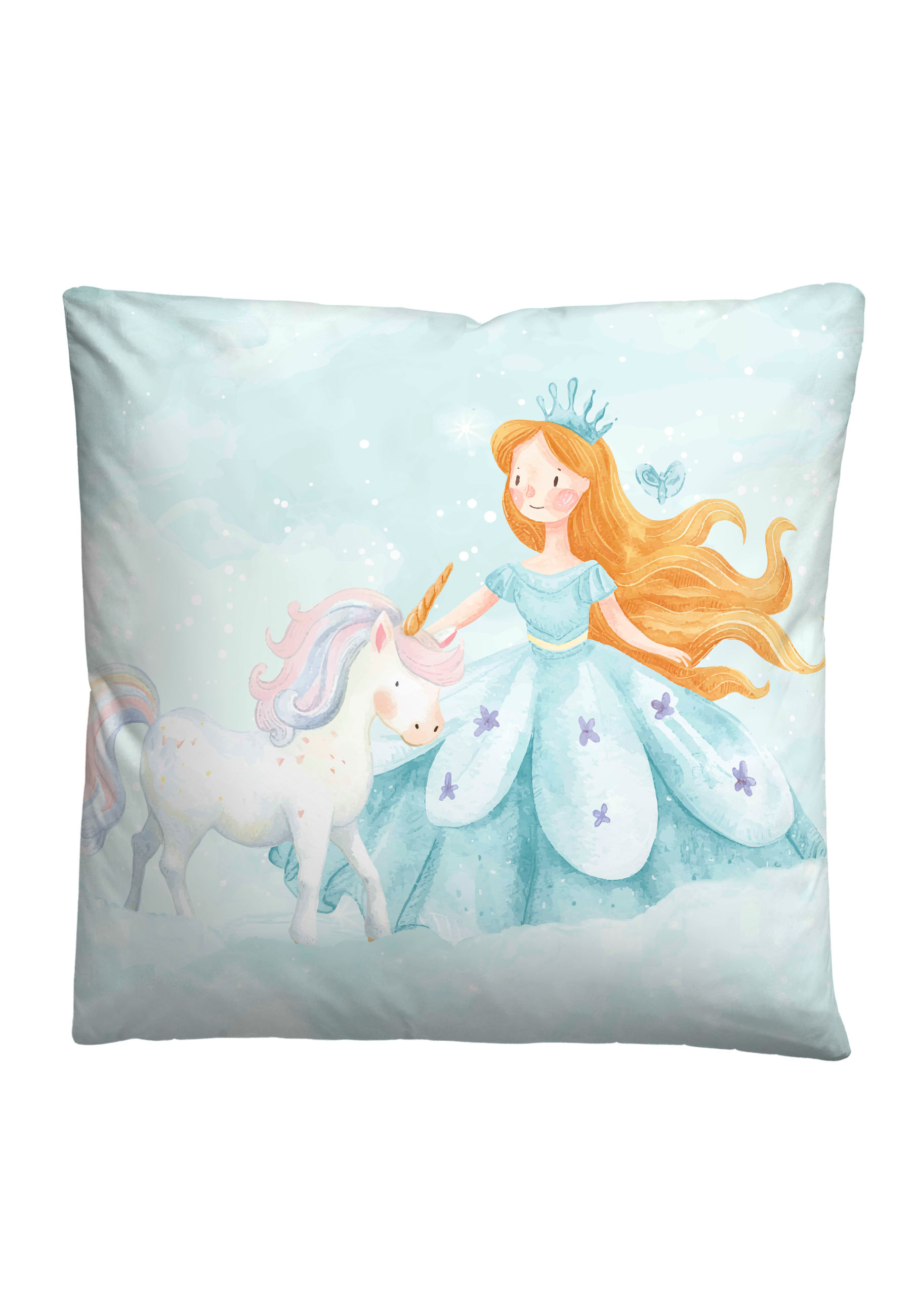 In sanftem Cielblau erstrahlt das zauberhafte Motiv von Prinzessin und Einhorn – ein Duo, das für magische Abenteuer im Land der Träume sorgt.