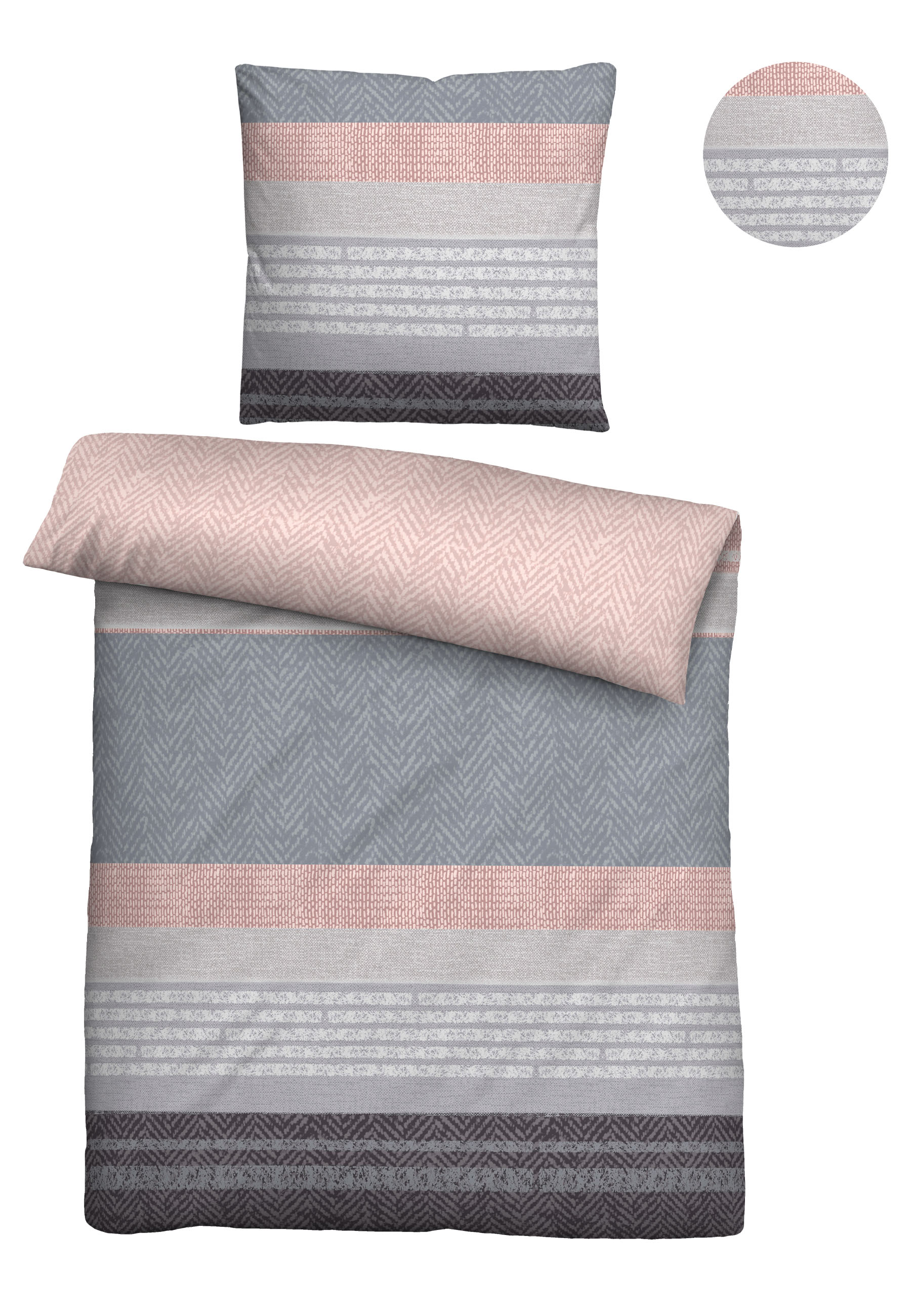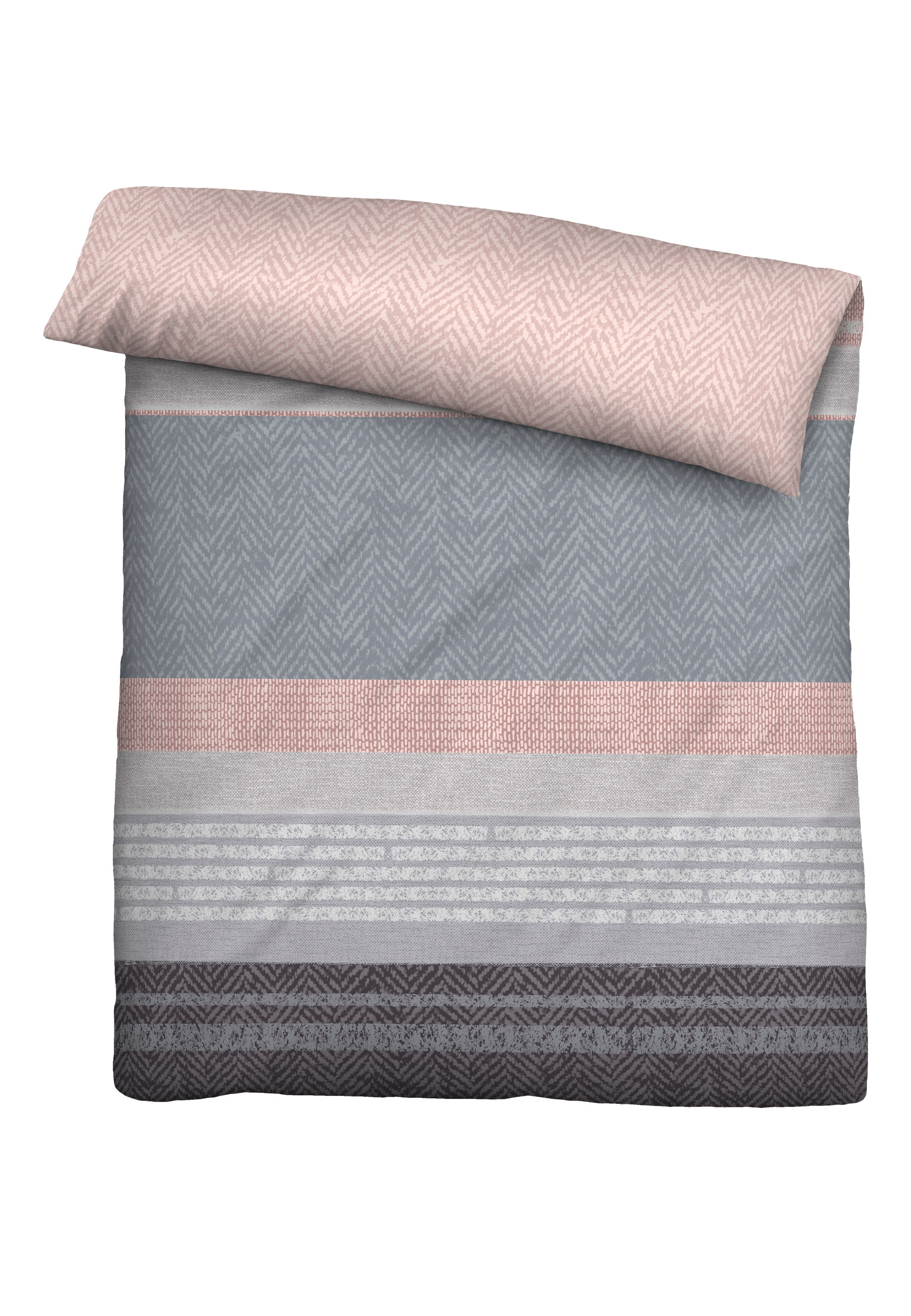 Verwöhne dich mit der traumhaft weichen Feinbiber-Bettwäsche, die mit ihrem modernen Quermuster in eleganten Farbtönen von Silber, Grau und zartem Rosa für ein stilvolles Ambiente sorgt.