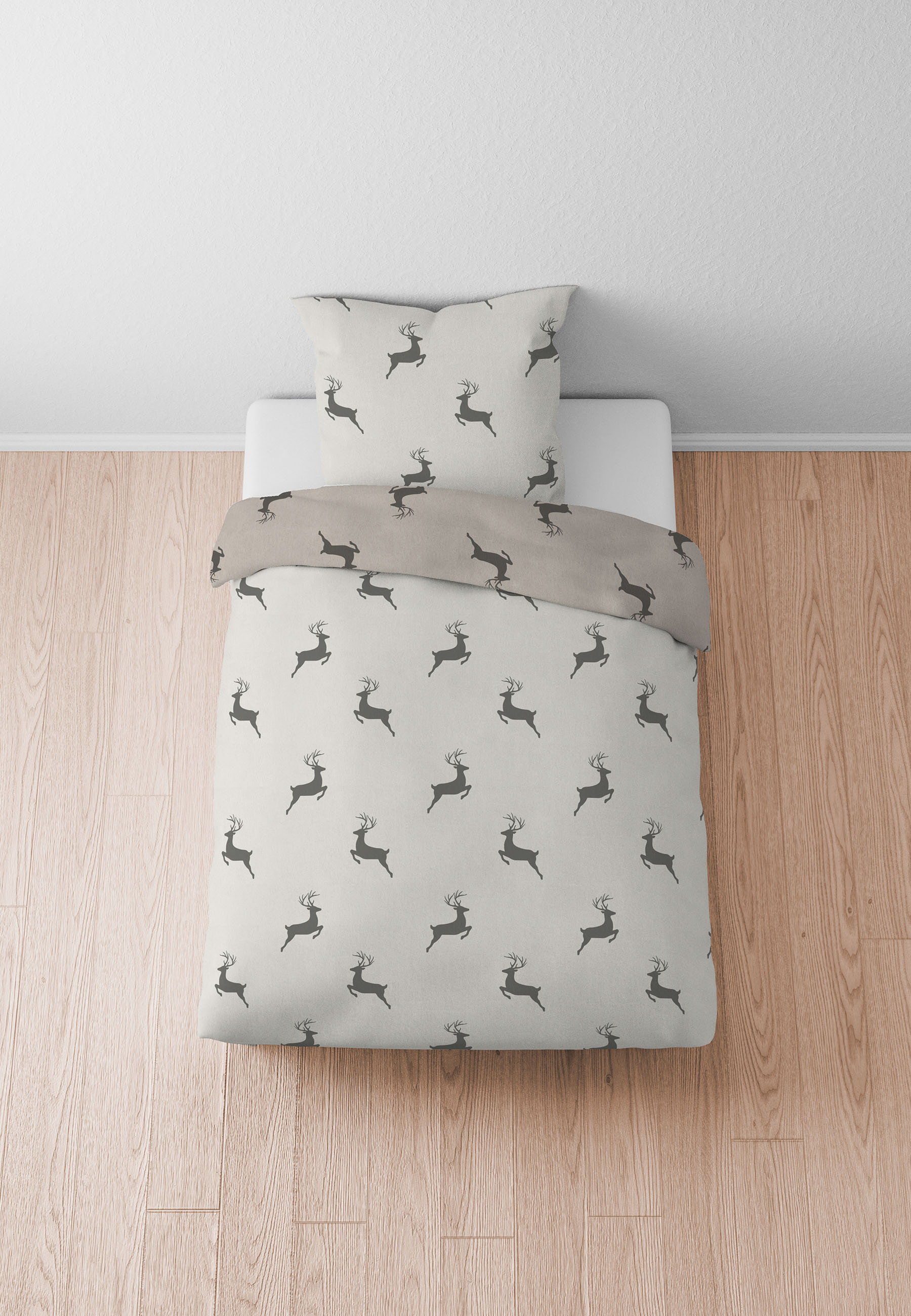 Das sanfte Naturfarbton-Design wird durch das liebevoll gestaltete Motiv kleiner Hirsche abgerundet und bringt einen Hauch von Wald- und Winteridylle ins Schlafzimmer. Die Garnitur schafft durch ihre dezenten, natürlich hellen und dunkleren Farbtöne der Vorder- und Rückseite ein ruhiges und gemütliches Ambiente.