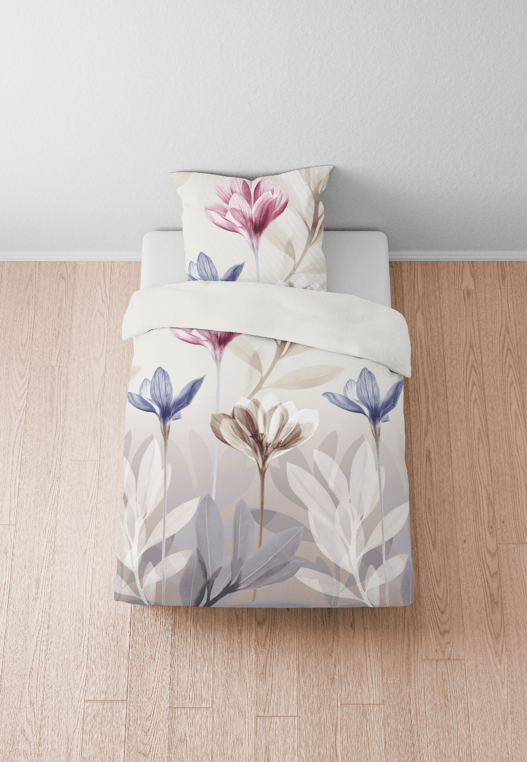 Eine dezent florale Bettwäschegarnitur in Seersucker-Qualität, absolut bügelfrei und schnell trocknend.