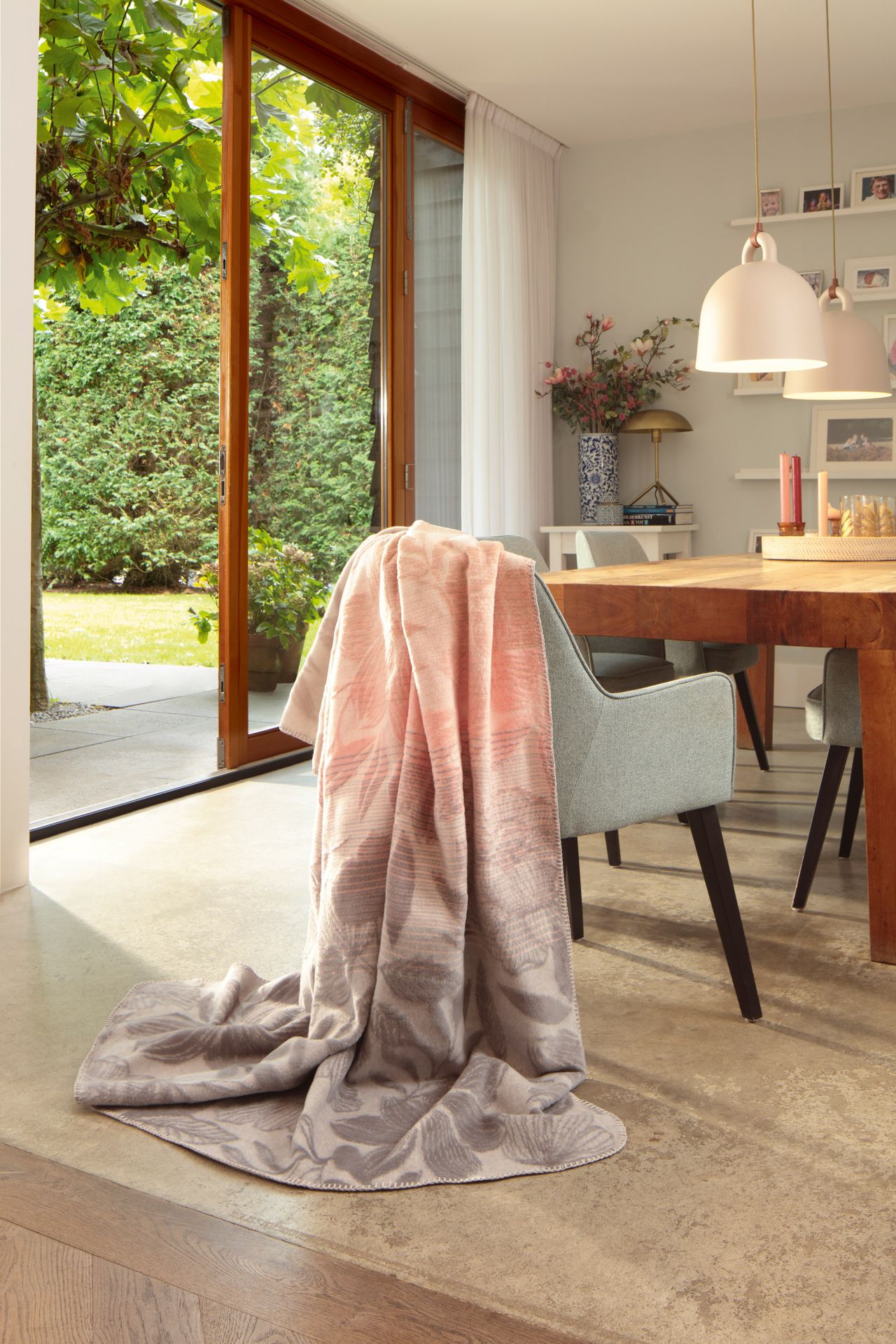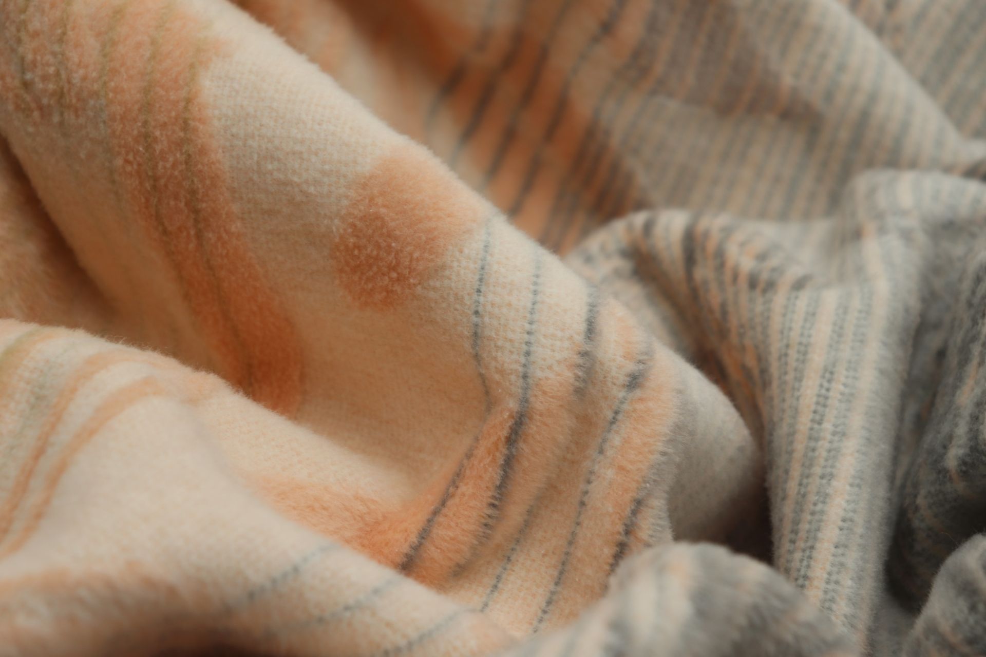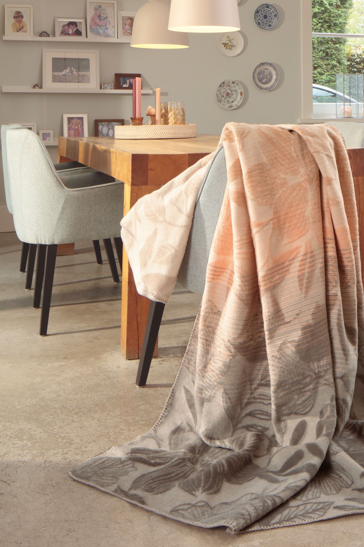 Diese außergewöhnliche Wohndecke ist ein echtes Highlight. Das dezente, aber sehr detailreich gearbeitete Allover-Blumendessin ist unterlegt mit feinen Streifen und einem wirkungsvollen Farbverlauf, der elegante, erdige Grautöne mit sanftem Ecru und zartem Apricot kombiniert. Der Clou aber ist die Oberfläche: Durch eine spezielle Webtechnik hat die Kuscheldecke eine fühlbare, reliefartige Struktur und einen voluminösen Griff. Ein exquisites Wohnaccessoire, das alle Blicke auf sich zieht.