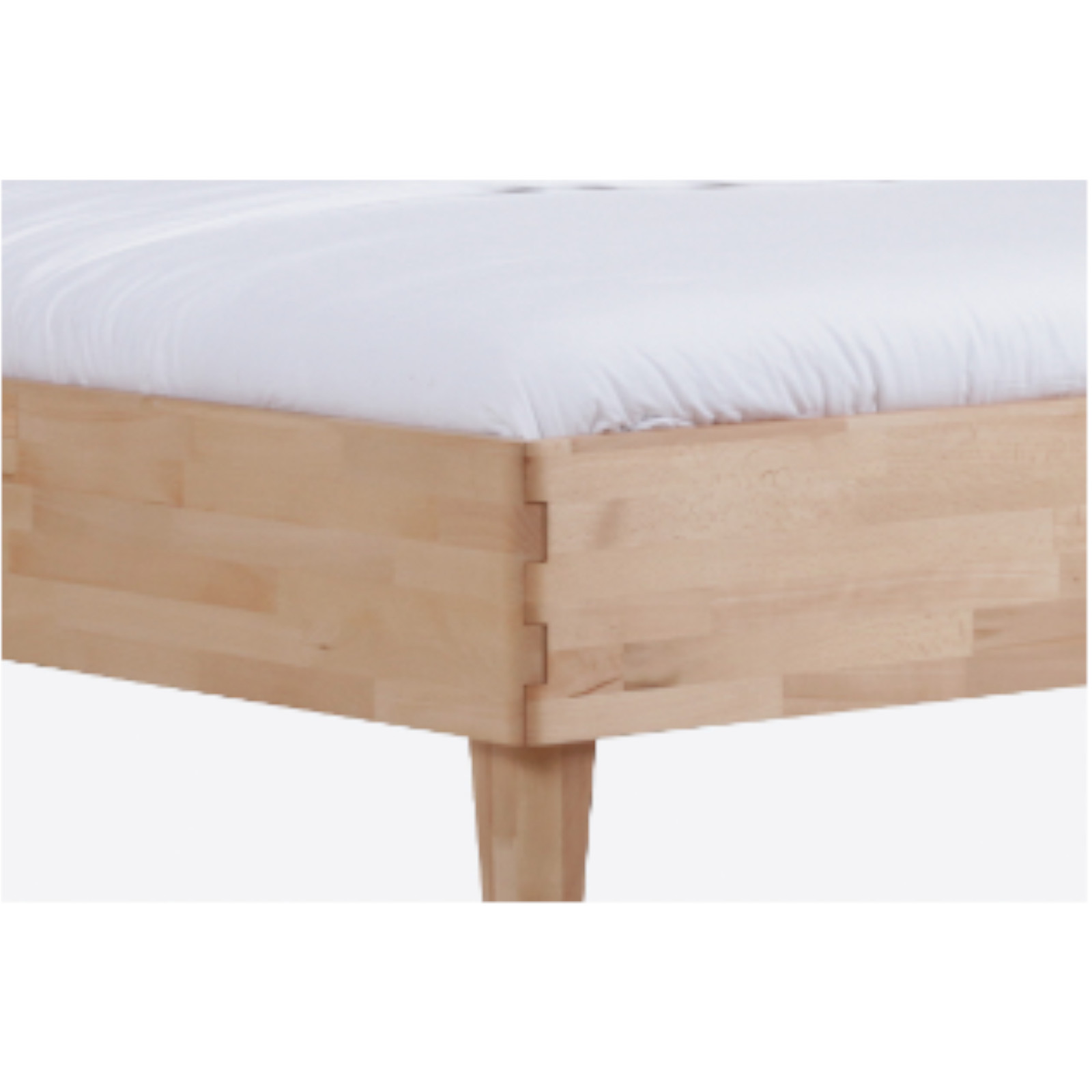 Stabiler Massivholz-Bettrahmen mit verstellbarer Einlegetiefe. Rahmen gezapft, mit Kopfteil, Füße schräg.