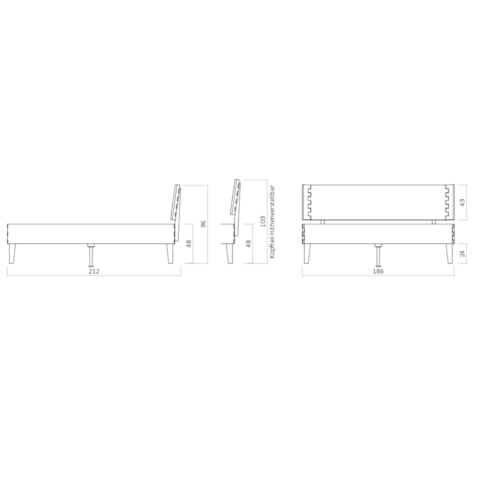 Stabiler Massivholz-Bettrahmen mit verstellbarer Einlegetiefe. Rahmen gezapft, ohne Kopfteil, Füße schräg.