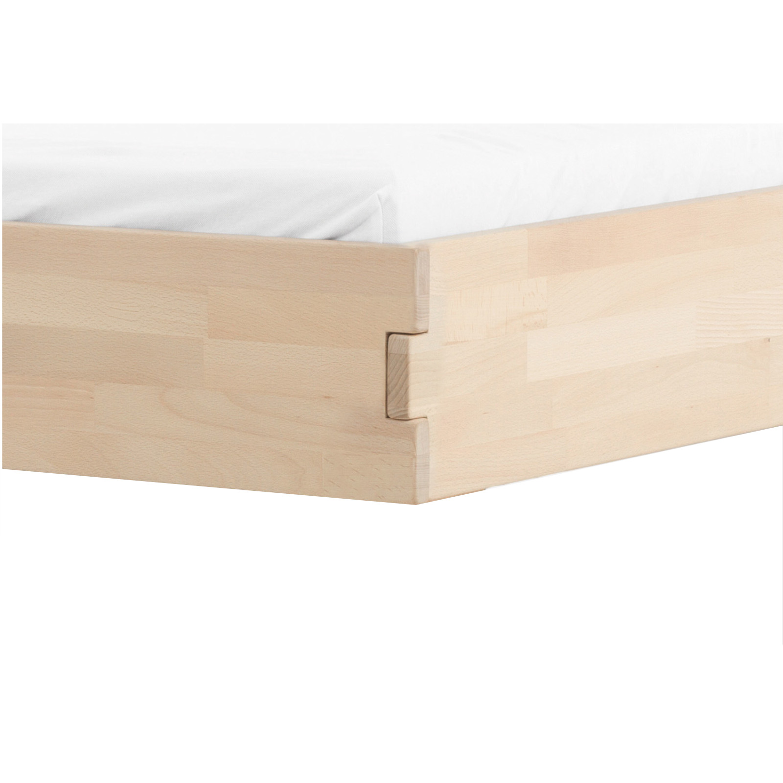 Stabiler Massivholz-Bettrahmen mit verstellbarer Einlegetiefe.