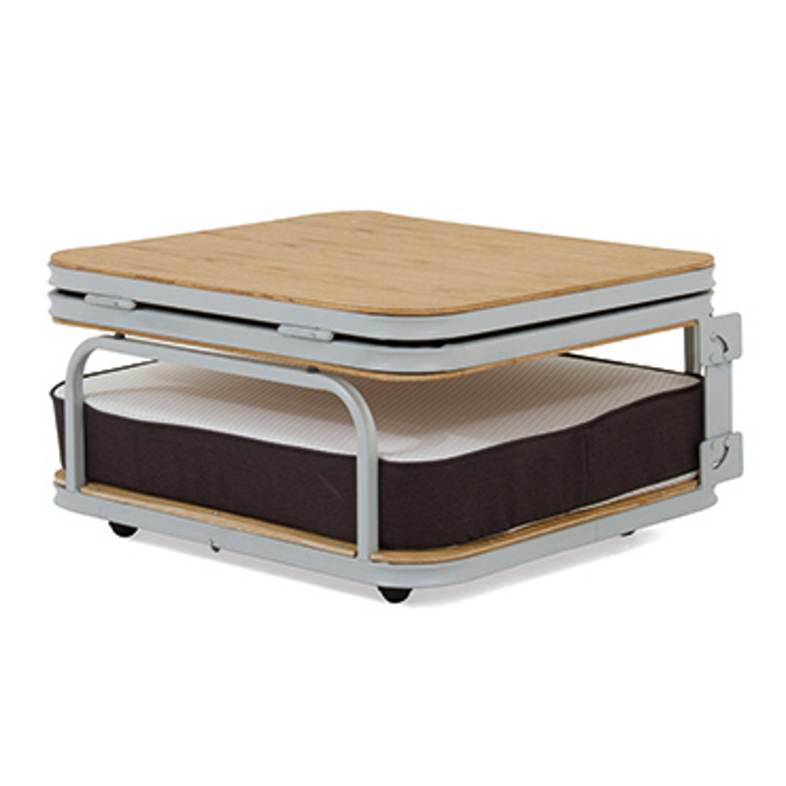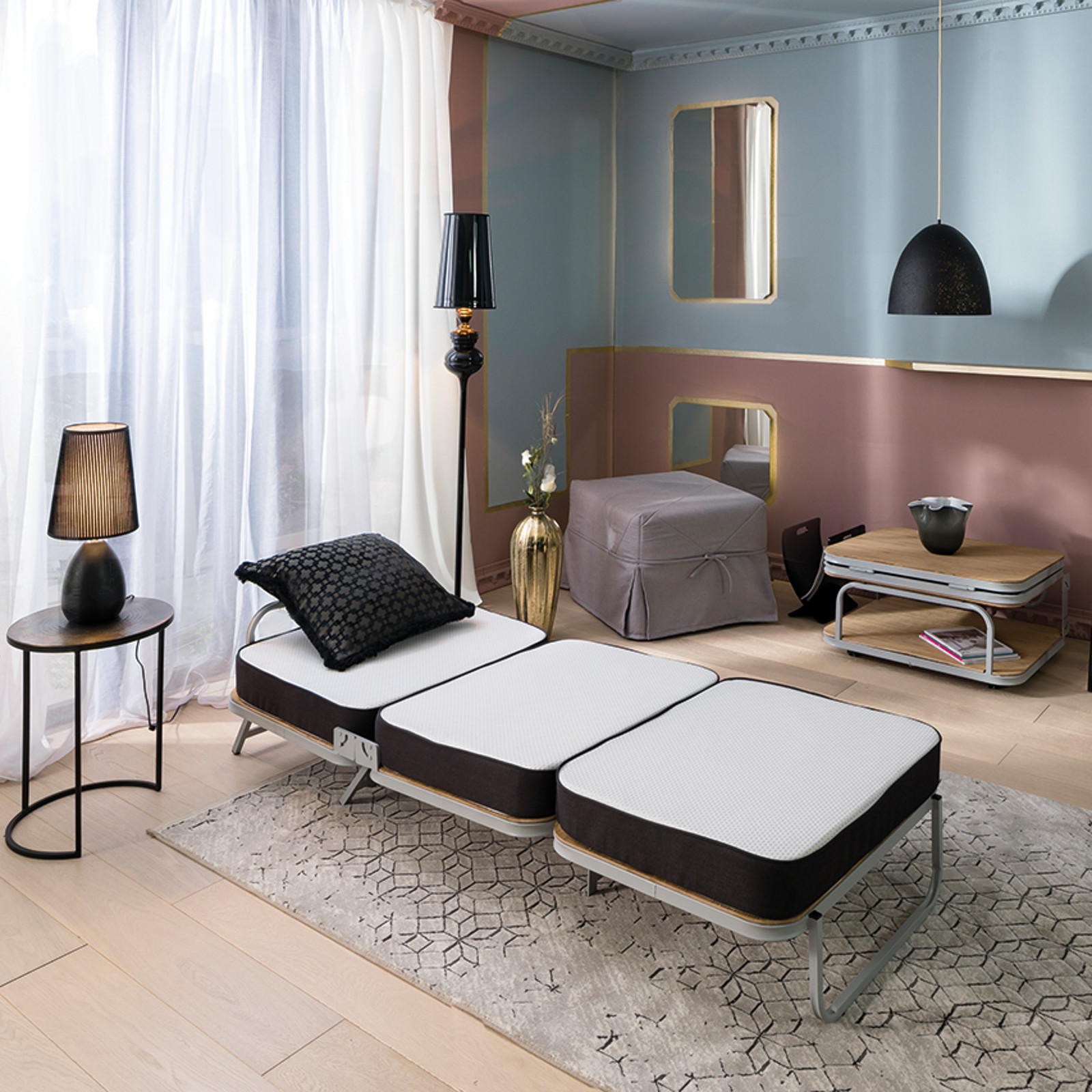 Mit der neuen Klappautomatik kann das Raumsparbett bei Nichtgebrauch platzsparend verstaut werden.