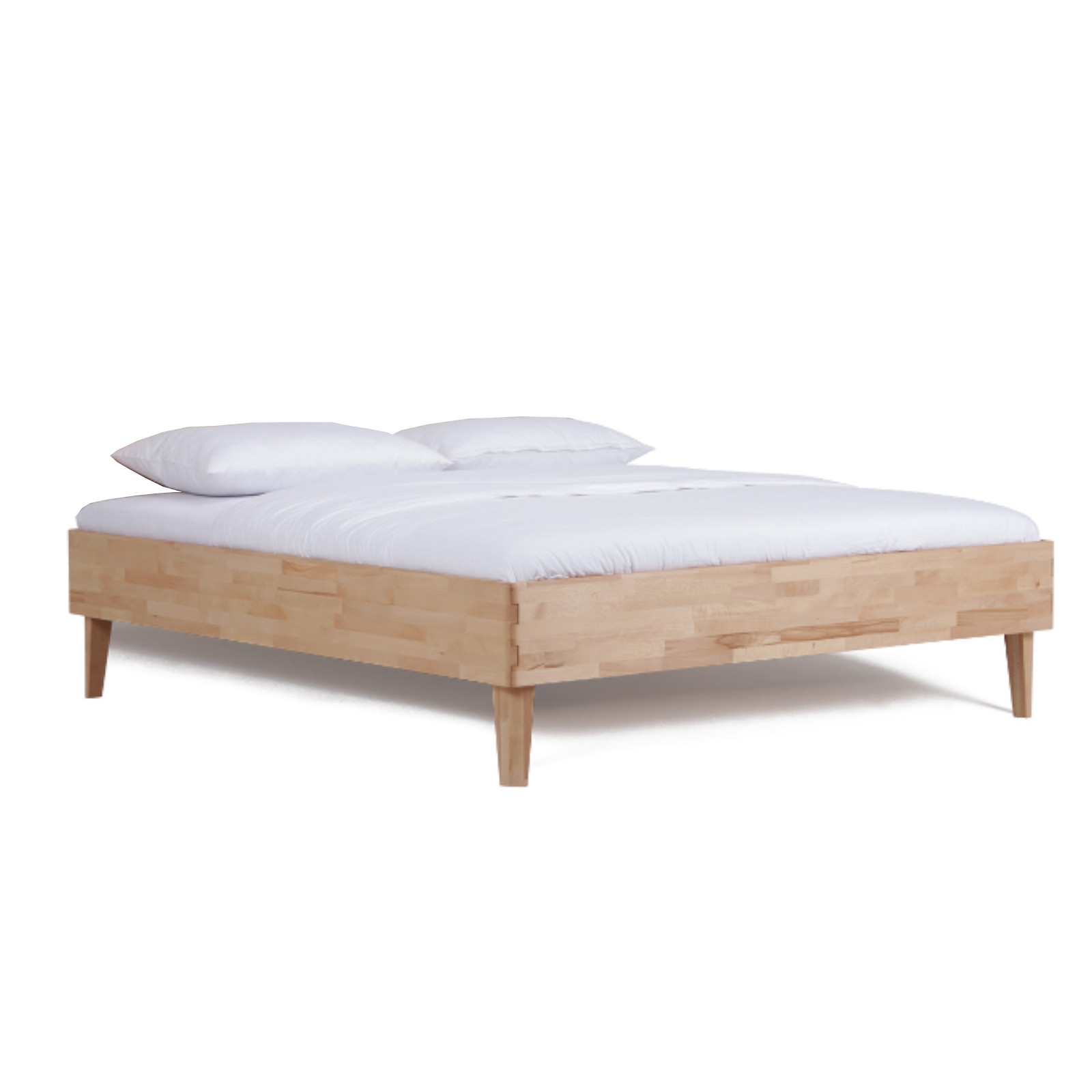 Stabiler Massivholz-Bettrahmen mit verstellbarer Einlegetiefe. Rahmen gezapft, ohne Kopfteil, Füße schräg.