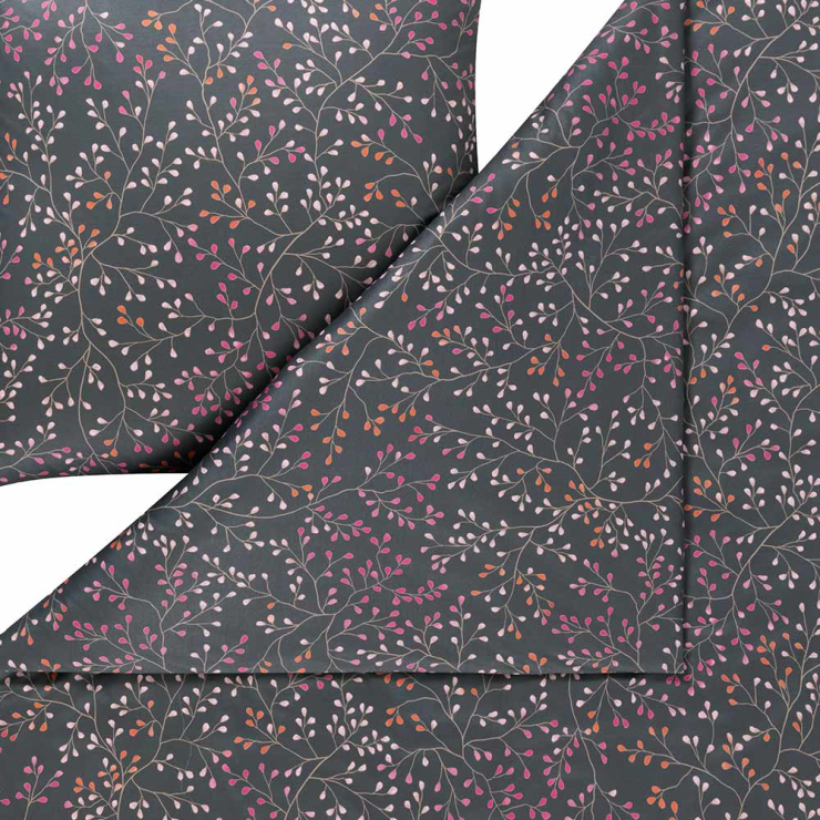 In dezentem Grau bringt die Atelier Garnitur Aline mit ihrem verspielten Zweig- und Blättermuster in zarten Rosa-, Fuchsia- und Naturtönen eine feminine Leichtigkeit ins Schlafzimmer. Der dunkelgraue Hintergrund verleiht dem Motiv Tiefe und setzt die feinen Farbakzente stimmungsvoll in Szene, wodurch ein moderner und zugleich eleganter Look entsteht.