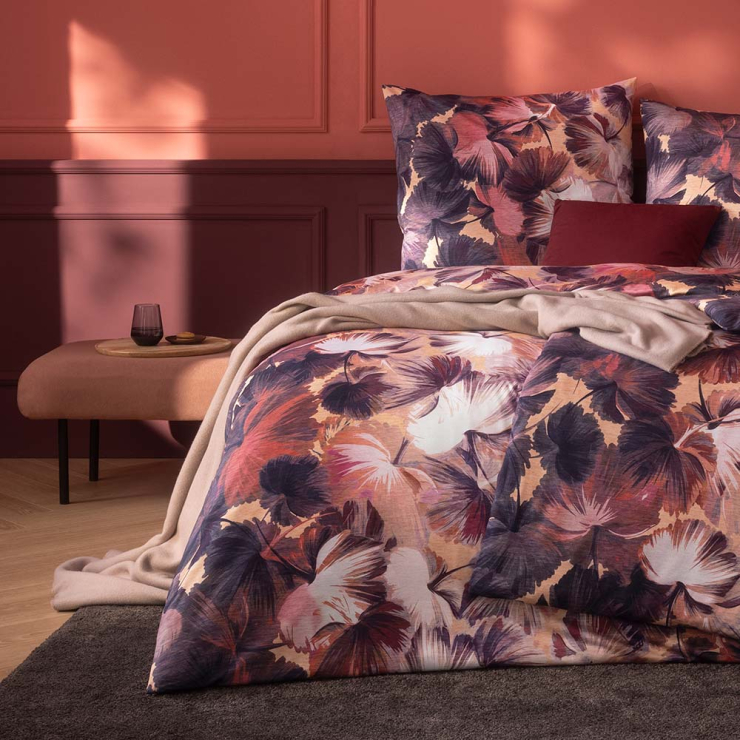 Die Bettwäsche Pia in der Farbe Vino überzeugt mit einem auffälligen floralen Aquarellmuster in warmen Beerentönen, zartem Rosé, sanftem Weiß und tiefem Violett. Die Blattmotive wirken lebendig und künstlerisch und bringen eine stimmungsvolle Note ins Schlafzimmer.