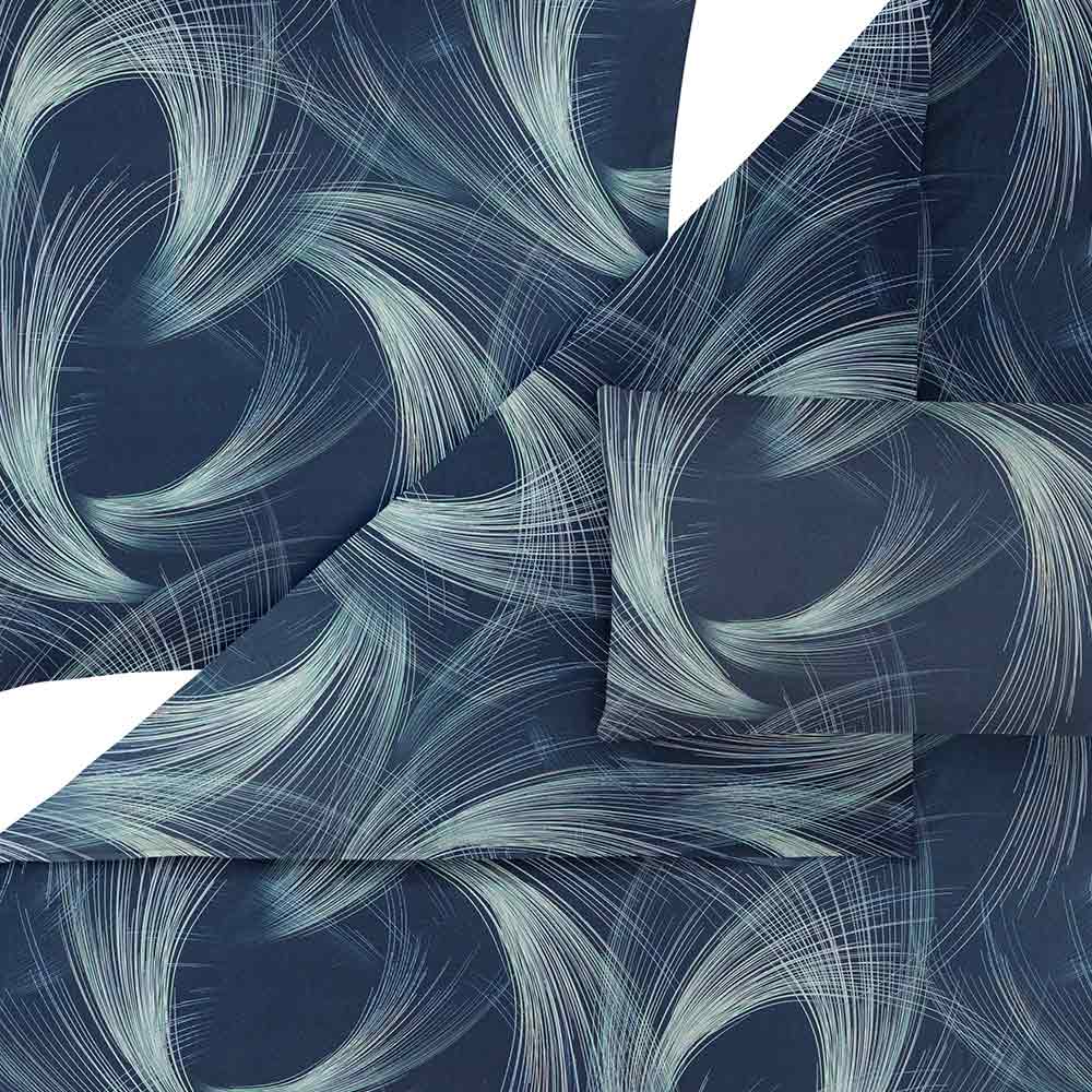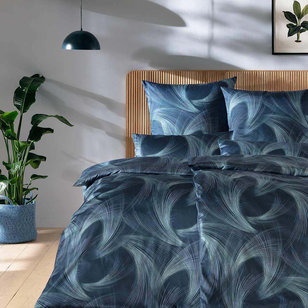 Die Mako-Satin-Bettwäsche Lino in der Farbe Navy bringt moderne Eleganz und künstlerische Dynamik in dein Schlafzimmer. Das abstrakte Linienmotiv in fließendem Hellblau, Mint und Petrol entfaltet sich eindrucksvoll auf einem tiefen Navyblau – perfekt für designaffine Wohnkonzepte mit ruhiger Farbwirkung.