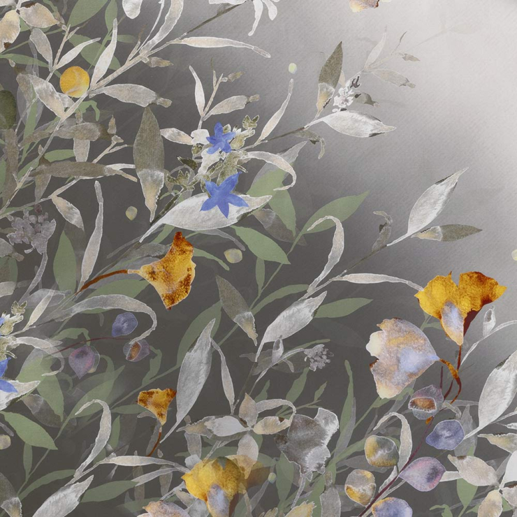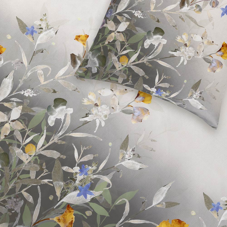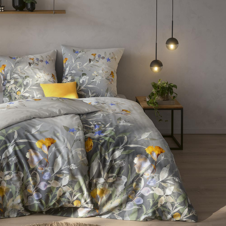 Die Bettwäsche Celia in der Farbe Salbei entführt in ein kunstvolles Blütenmeer, das wie ein zartes Aquarell auf dunklem Grund erblüht. Feine Blätter und Blüten in Gelb, Violett, Blau und Grün scheinen beinahe zu schweben, während der nach oben heller werdende Farbverlauf dem Motiv Tiefe und eine beruhigende Leichtigkeit verleiht. So entsteht ein elegantes Zusammenspiel aus lebendiger Farbigkeit und sanfter Ruhe, das dem Schlafzimmer eine besondere, fast malerische Atmosphäre schenkt.