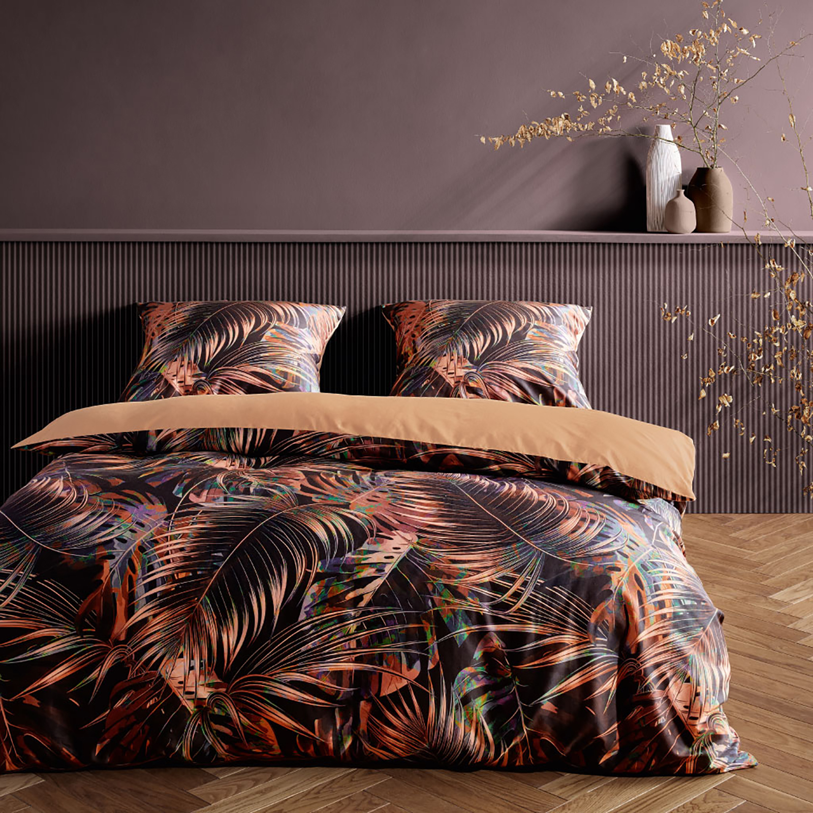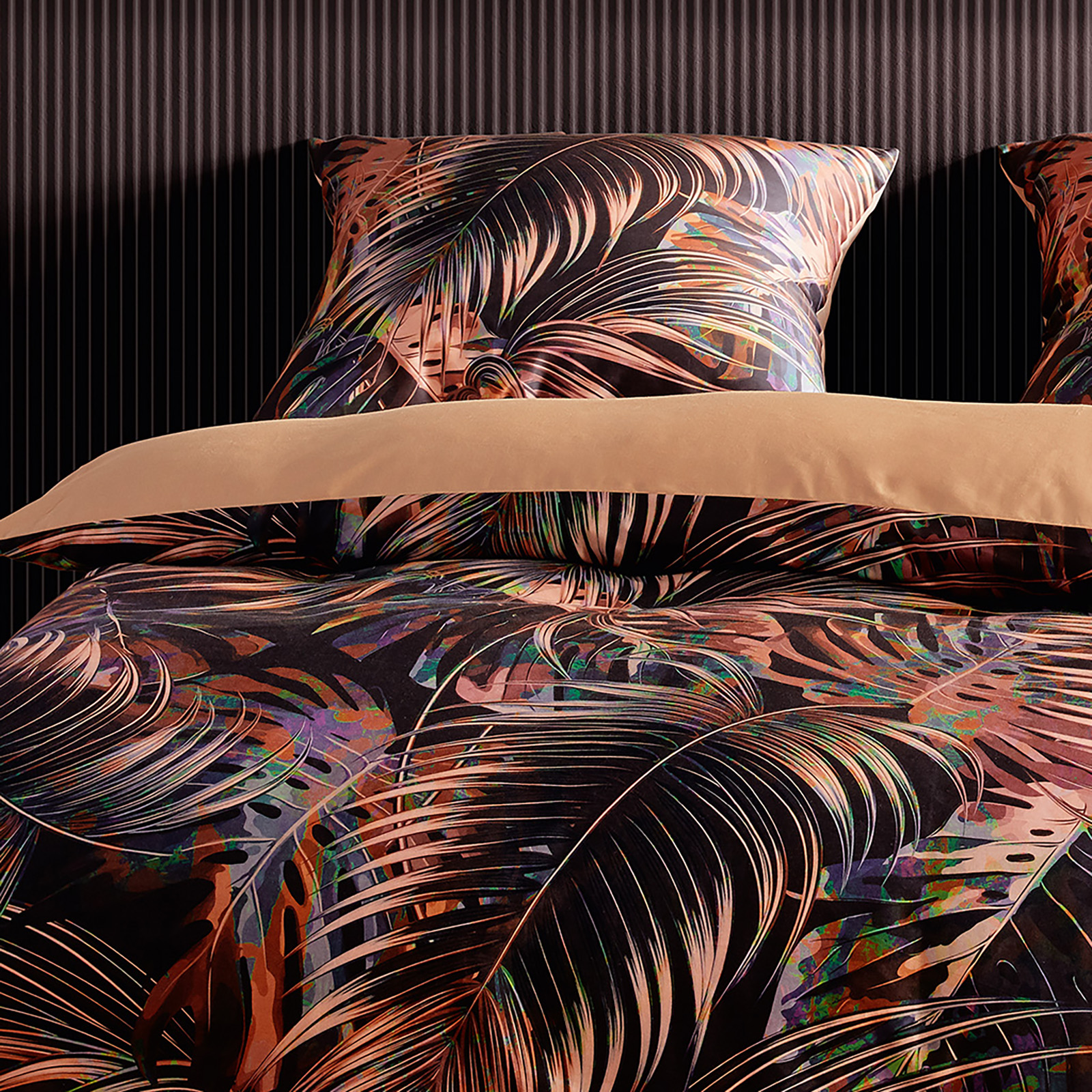 Feine Mako Satin-Wende-Bettwäsche mit hochwertigem Digitaldruck aus 100% Baumwolle mit Reißverschluss. Wunderbar atmungsaktiv und angenehm auf der Haut ist Mako Satin die ideale Bettwäsche-Qualität für das ganze Jahr. Große, exotische Blätter zieren den dunklen Fond dieser traumhaften Bettwäsche.