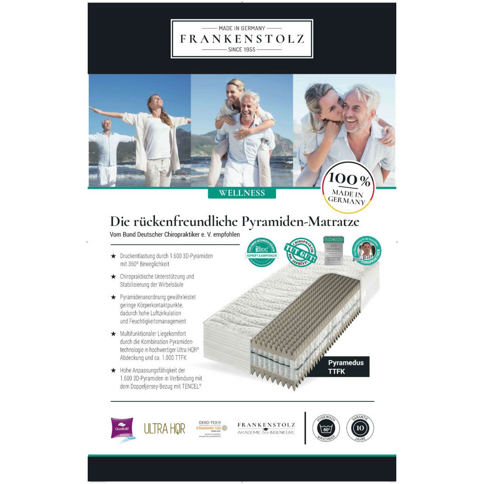 Der chiropraktische Pyramidenschnitt unterstützt und stabilisiert die Wirbelsäule punktelastisch. Die Pyramidenanordnung gewährleistet geringe Körperkontaktpunkte und sorgt für eine hohe Luftzirkulation und Feuchtigkeitsmanagement.