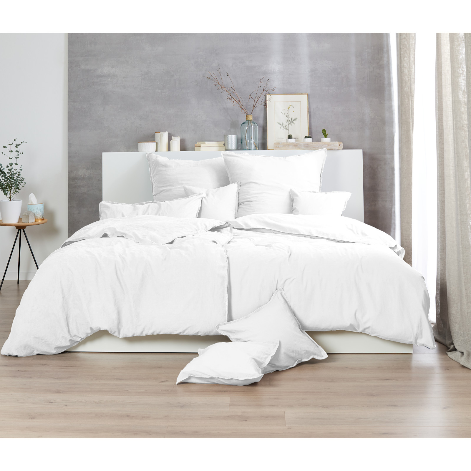 Die stone-washed Bettwäsche besteht aus strapazierfähigem, soften Baumwoll-Gewebe.