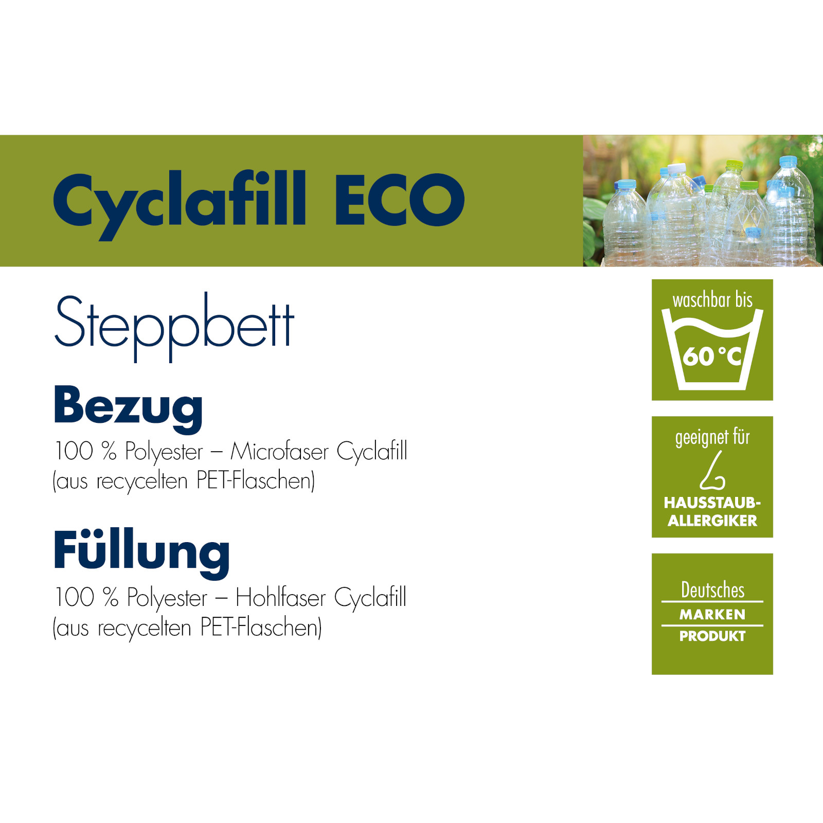 Dieses 4-Jahreszeiten-Steppbett besteht zu 100 % aus recycelten PET Flaschen.