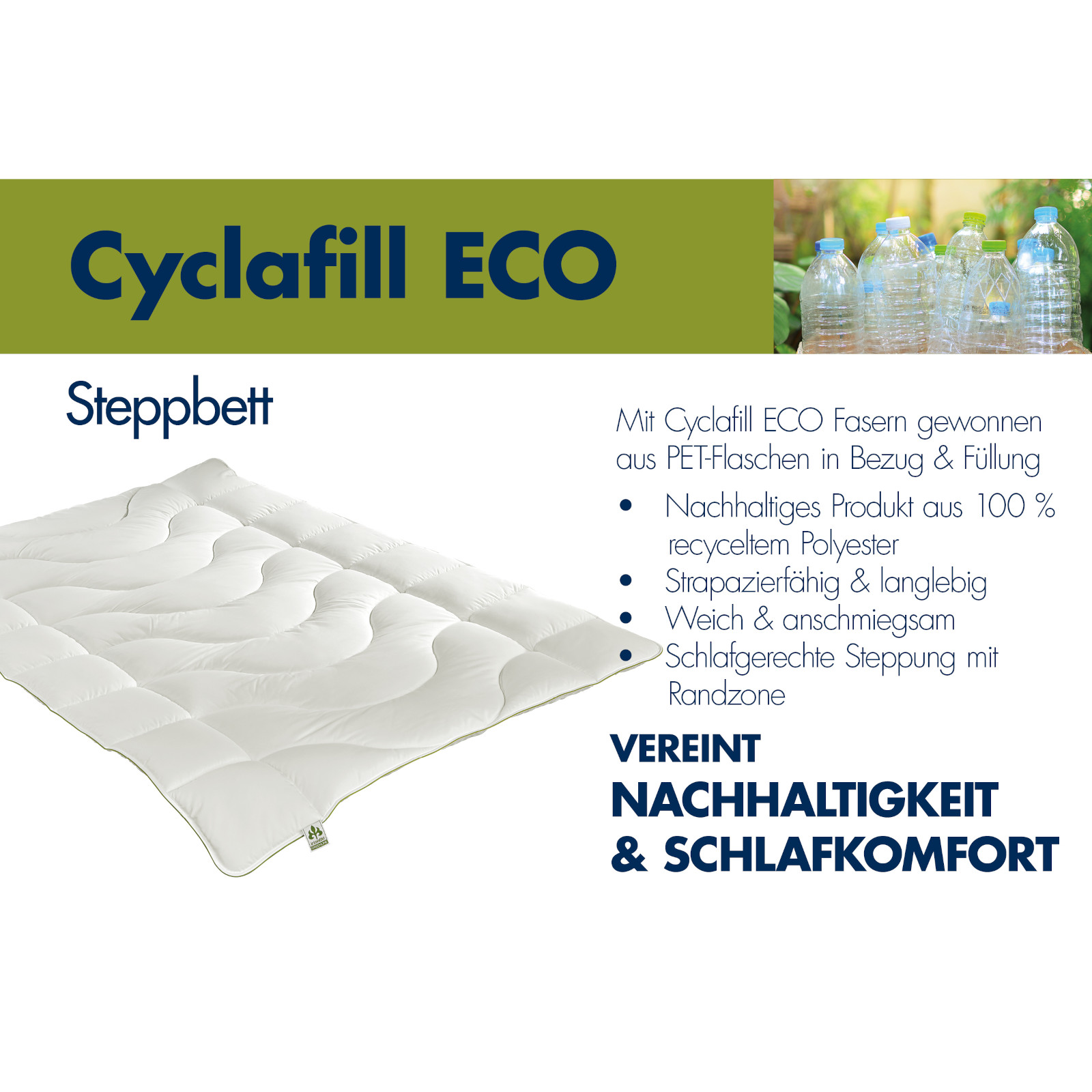 Dieses Duo-Steppbett besteht zu 100 % aus recycelten PET Flaschen.