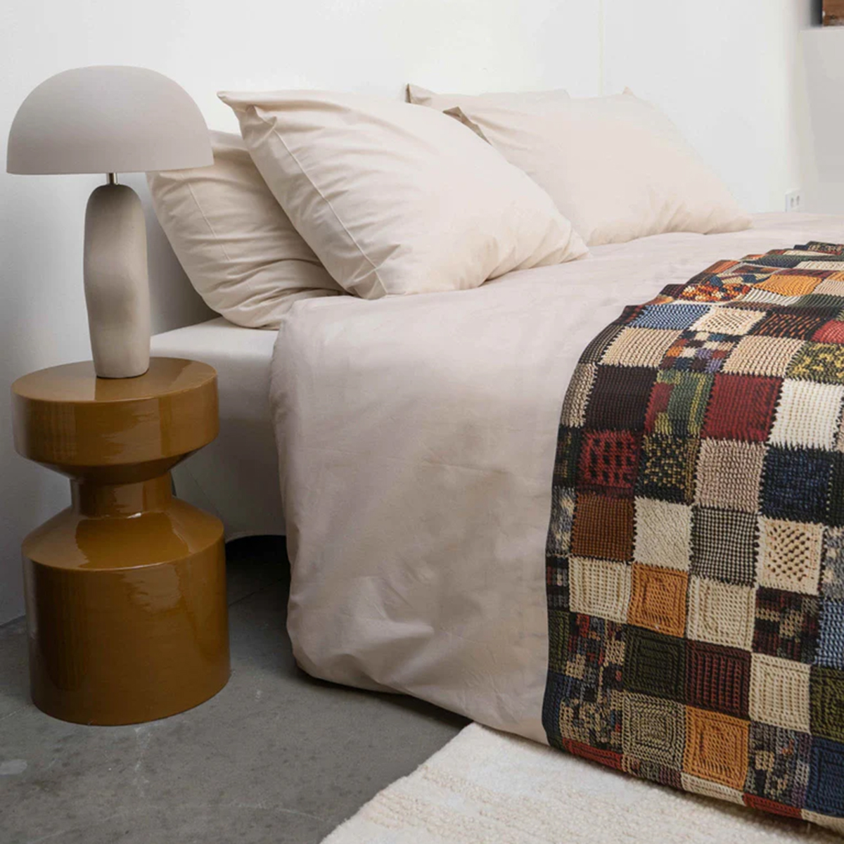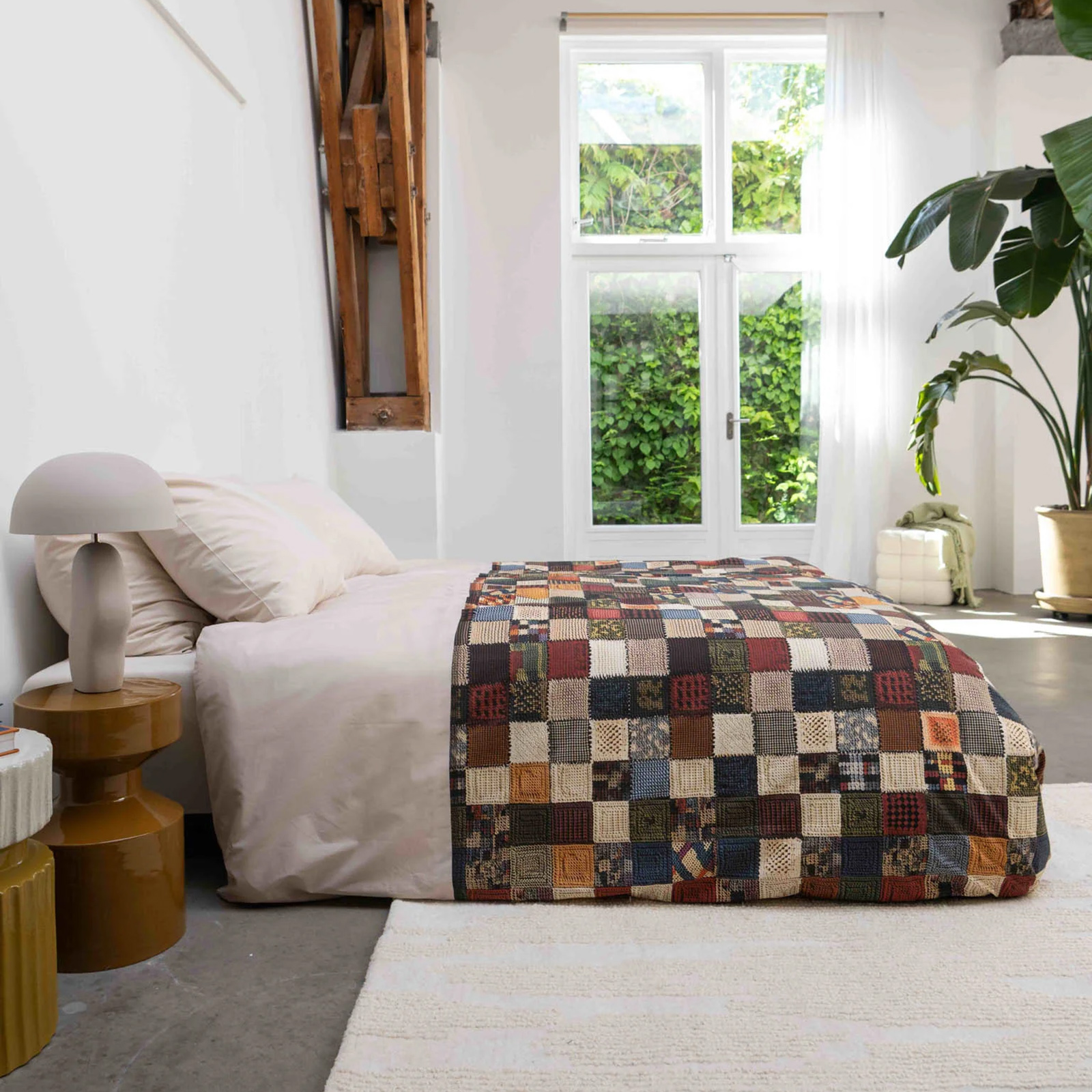 Diese Bettwäsche sieht aus wie ein liebevoll gehäkelter Quilt in nostalgischen Farben – komplett mit umgeschlagener Bettkante. Früher war vielleicht nicht alles besser, aber definitiv gemütlich. Gönn dir dein Quilty Pleasure.