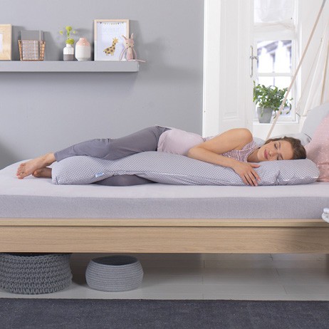 Mit Ihrer Zwei-Zonen-Füllung entlastet es Nacken- und Schulterpartie, während es gleichzeitig als perfekte Stütze für Babybauch und Beine dient.
