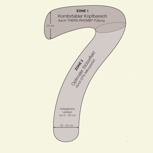 Die my7 hat einen abnehmbaren Kissenbezug. Damit auch Sie Ihre ideale Schlafposition erreichen können, verfügt Ihr neues Schlafkissen über 2 verschiedene Nachfüllöffnungen zu Füllstoffentnahme oder -zufuhr. Am äußeren Ende des Kopfteils finden Sie deshalb einen Reißverschluss im Kisseninlett. Durch Öffnen gelangen Sie an den THERA-RHOMB®-Füllstoff des „Kopfkissens“. Die zweite Öffnung ist am unteren Ende des langen Kissenkörpers eingelassen. Hierüber lassen sich unsere sandfeinen EPS-Mikroperlen erreichen.