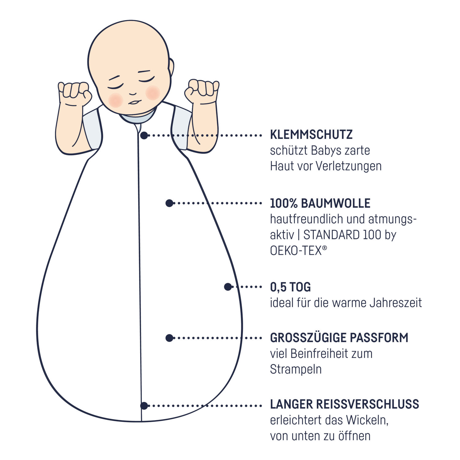 Der Babyschlafsack sollte möglichst passgenau sitzen und im Schulterbereich gut anliegen. Es sollten nicht weniger als 10cm Platz zwischen den Füßen und der Unterkante des Schlafsackes zur Verfügung stehen.